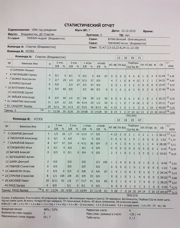 «Успех»: Каплиев – 20 (7 подборов), Самойлов – 8 (5 подборов), Струлев – 8 (4 подбора), Сахаров – 5 (4 передачи, 2 перехвата, 3 подбора), Аванесян – 4 (9 подборов), Шиян – 2.